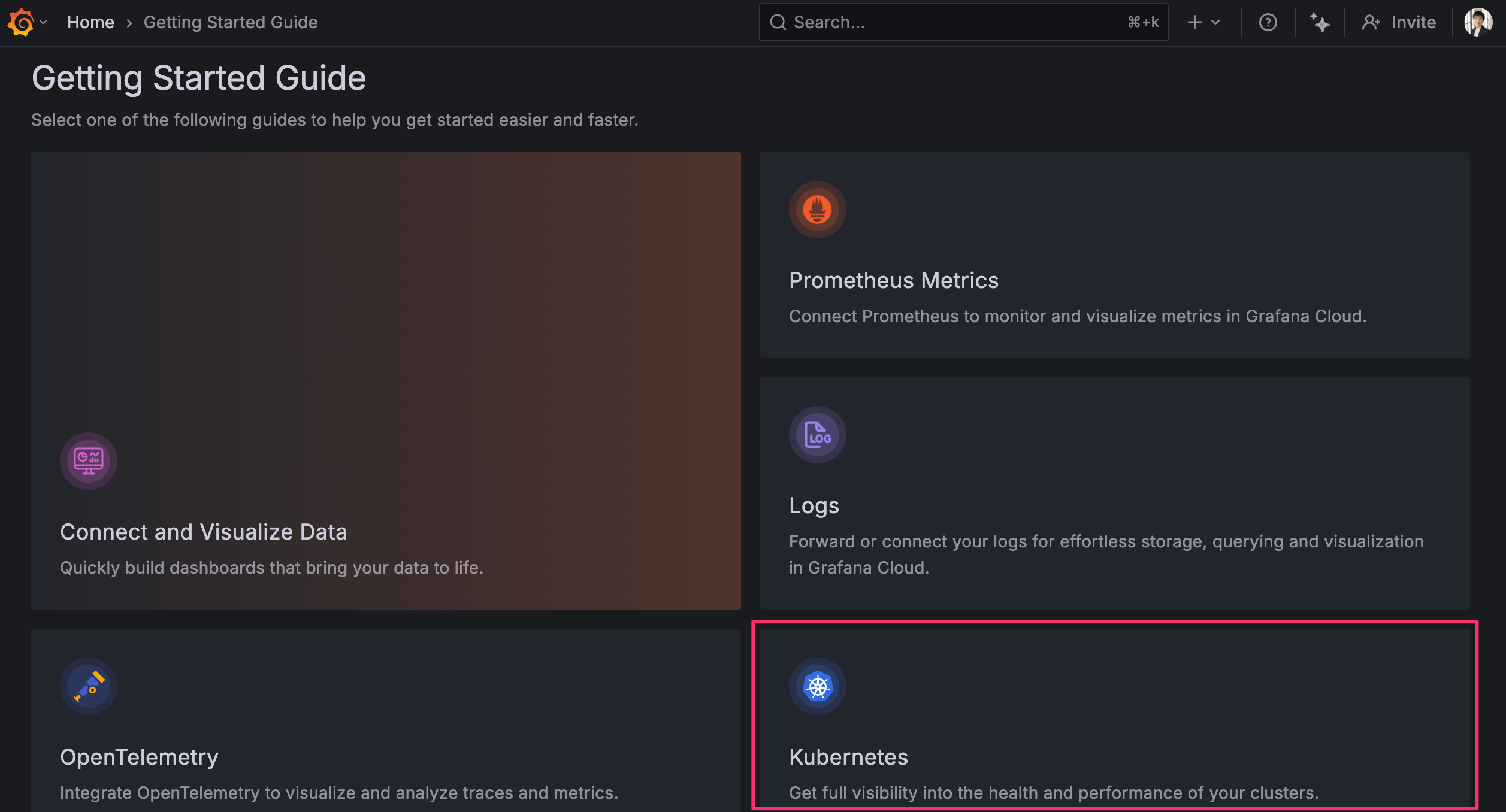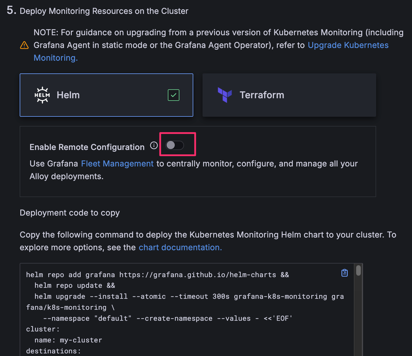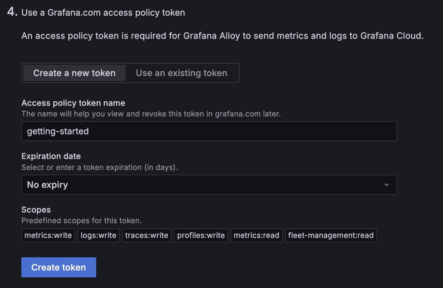 Getting Started Guide にはいくつか選択肢があるんですが、Kubernetes 上で使うなら Kubernetes を選択するのが最も良いです。OpenTelemetry の手順に従うと Fleet Management の設定が追加されるのに、生成される token には fleet-management:read