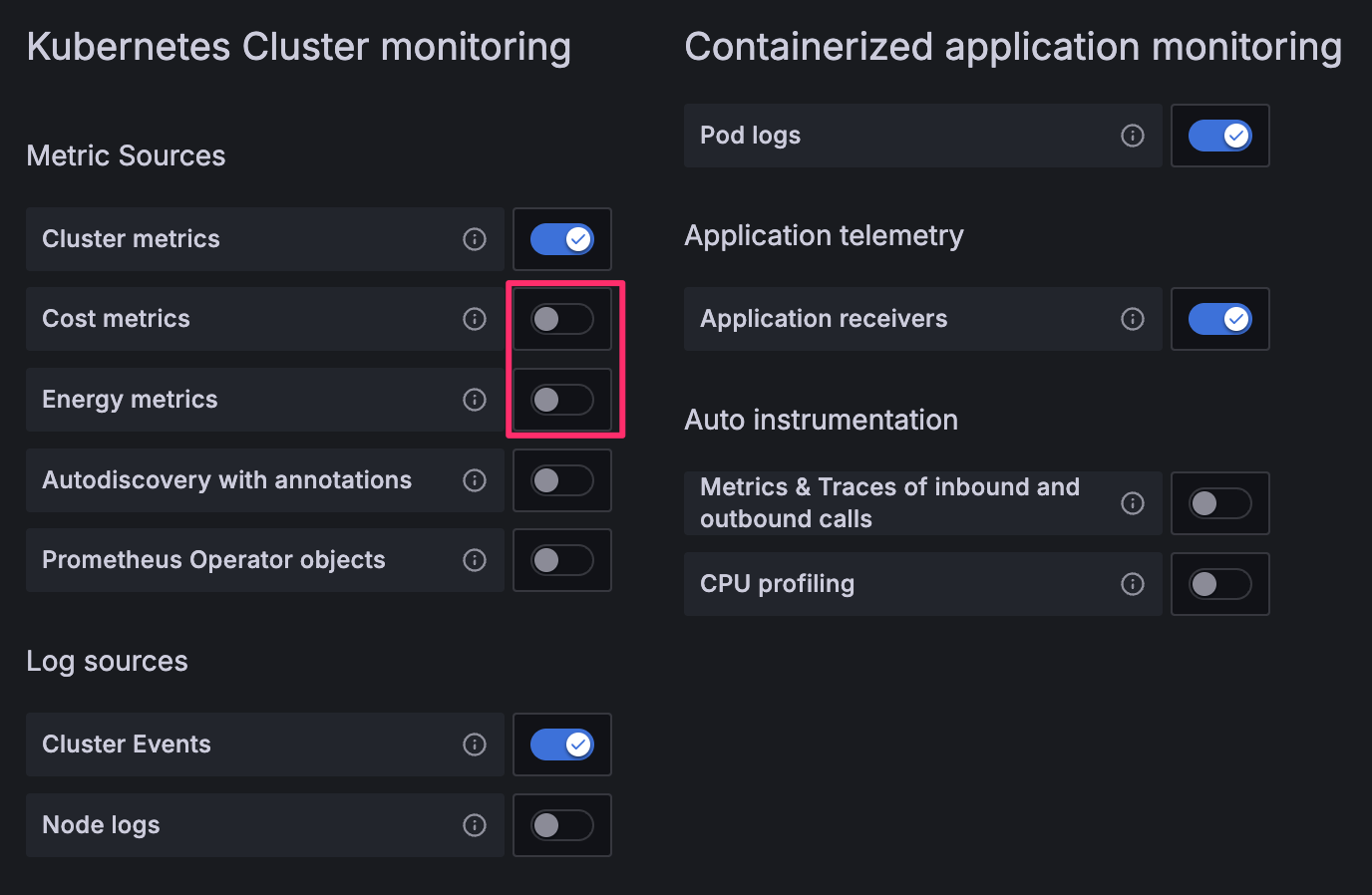 利用する機能についてはデフォルトで Cost metrics (OpenCost) と Energy metrics (Keplr) が有効になっていますが、個人的には必要性を感じなかったので無効にしています。