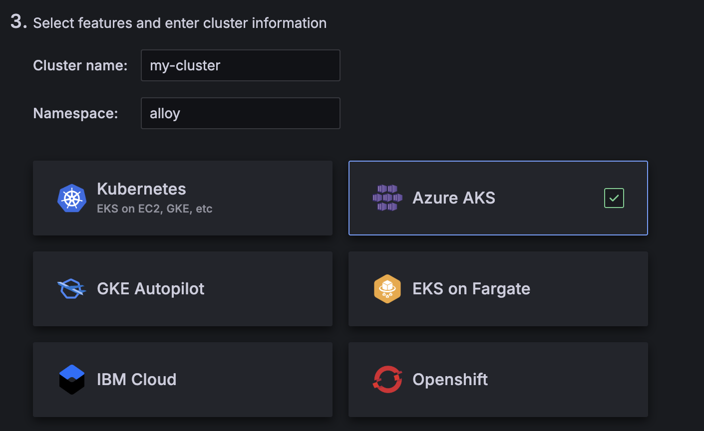 Namespace には Alloy のインストール先の namespace 名を指定します。今回は alloy とします。そして Kubernetes サービスとして自身の利用しているサービスを選択します。自分の場合は AKS で使いたかったので AKS を選択しています。