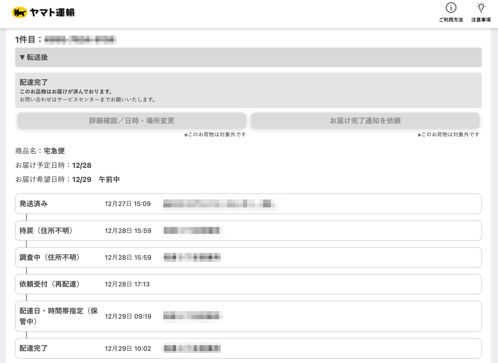 荷物が配達済みの場合(配送業者に関わらず共通)