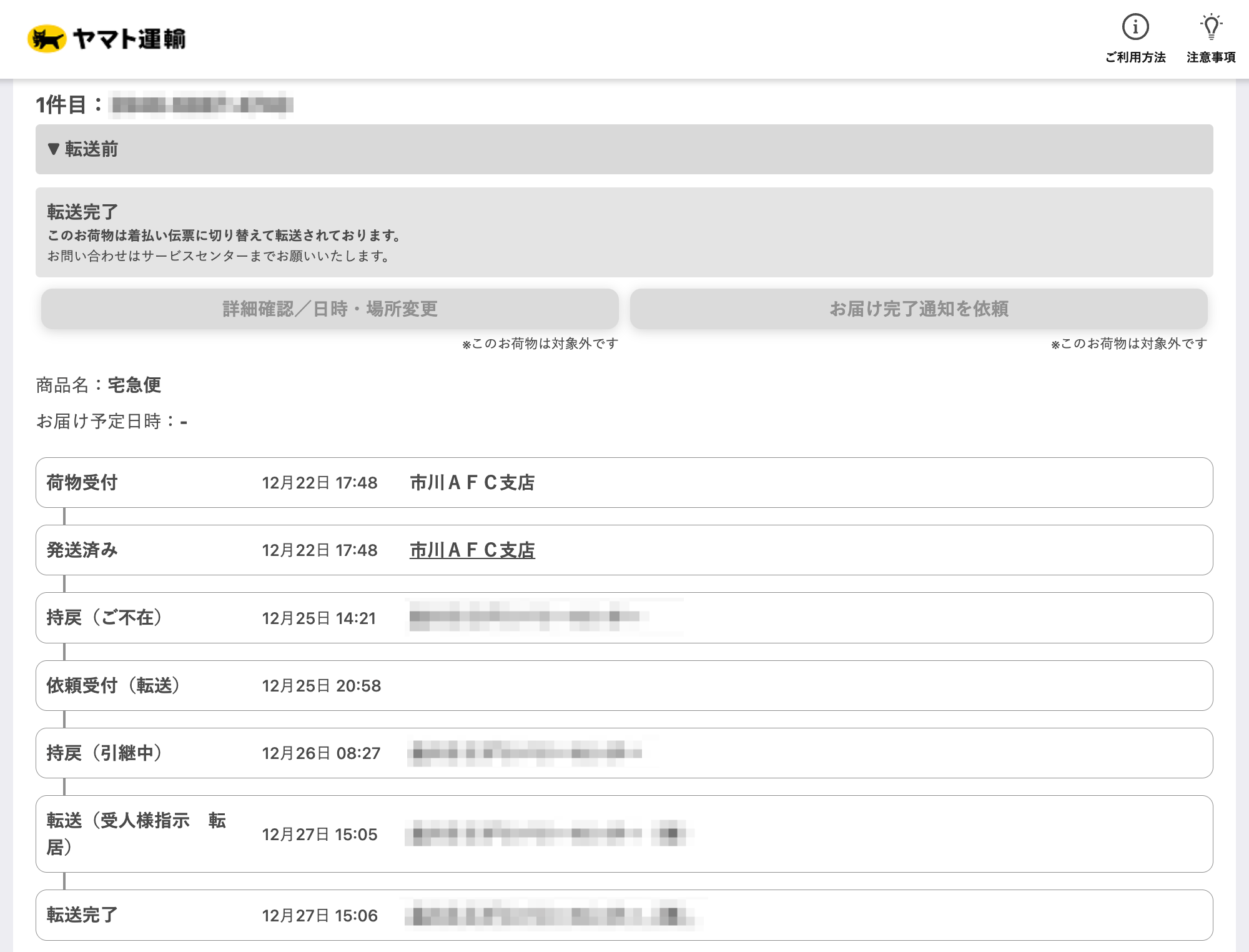 - 一度配達を試みて失敗した後(郵便受けに不在票が入れられた後)、旧住所の管理会社とやり取りして送り状番号を入手し、ヤマト運輸に連絡して現住所に転送してもらう